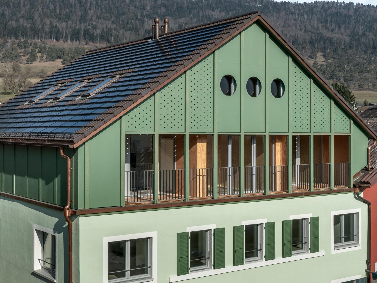 La densification voulue par la commune a vite abouti à un projet de surélévation. La capacité de l’immeuble a été portée à huit appartements. Dont deux en son sommet, ce qui a nécessité une profonde transformation de la toiture. Le studio biennois V9, les architectes Tanguy Poffet et Bastien Jeandrevin en particulier, l’ont ainsi totalement repensée. Ce faisant, ils ont tenu compte de l’état plutôt bon du bâtiment et de ses cachets patrimoniaux. Non sans rappeler son passé scolaire, tout en misant sur le calme dont vont pouvoir profiter ses futurs locataires, malgré la proximité d’une route à fort trafic.