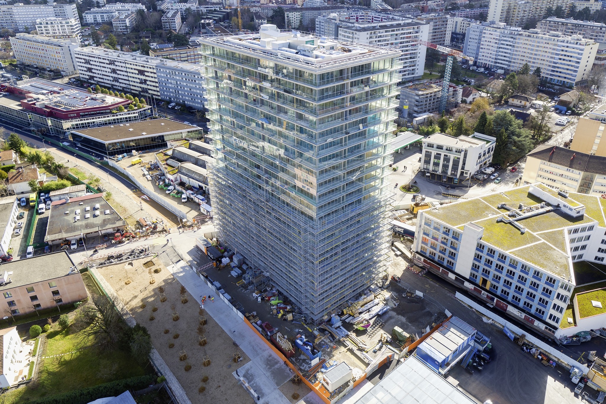 Impossible de la manquer. Avec sa vingtaine d’étages de verre et de métal, la tour Opale se dresse seule sur la nouvelle voie verte que trace la ligne du Léman Express. Tel un phare qui domine la nouvelle gare ferroviaire de Chêne-Bourg, elle redessine l’horizon de Genève. D’ici mi-mai, les premiers locataires vont prendre possession de leur appartement, de leurs bureaux ou de leur commerce. Et pourtant le coronavirus a frappé fort ici aussi ; le chantier a été mis à l’arrêt. Mais les ultimes travaux de second œuvre ont redémarré avec des consignes strictes de sécurité. L’ouvrage n’a pris que trois semaines de retard…