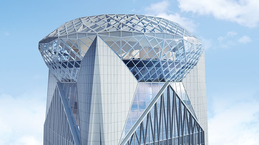 devait être couronné d'un atrium en verre en forme de diamant, haut de trois